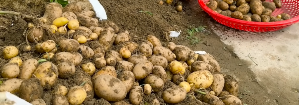 After about 3 months (or when the plants’ leaves start to yellow and die back), your potatoes are ready to harvest. This timing aligns with the image of a gardener collecting a large yield from styrofoam boxes after 3 months. To check, gently dig around one plant—if the potatoes are 2-3 inches in diameter, they’re ready.
